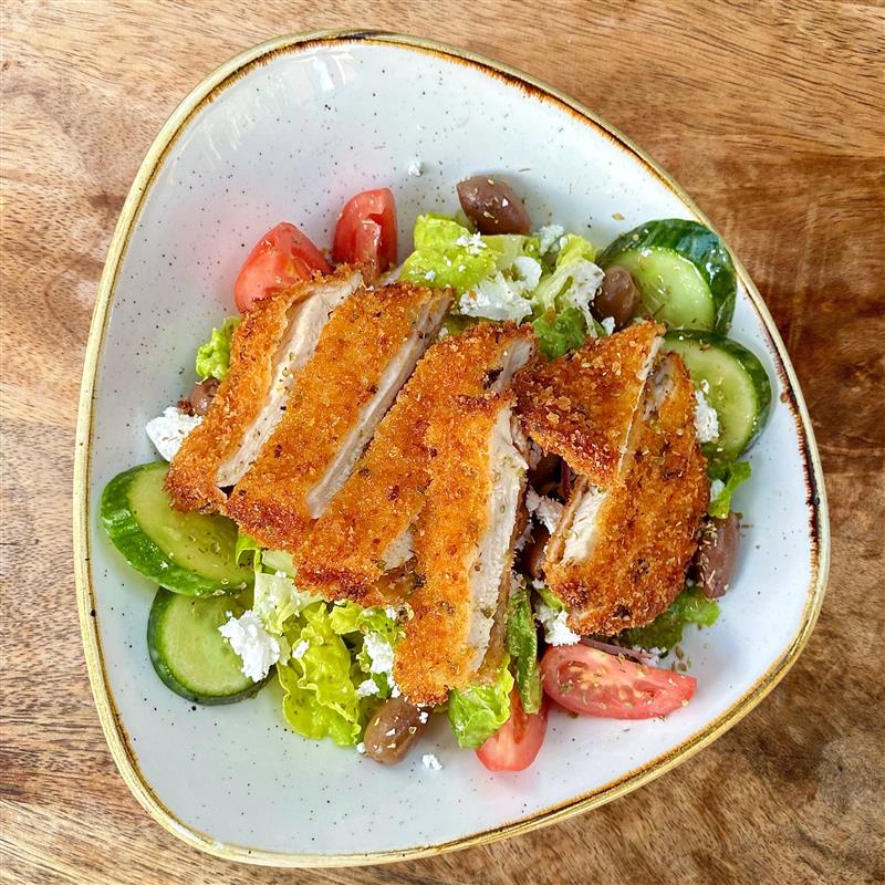 Housemade vegan schnitzel, twice cooked eggplant, vegan mozzarella and Napoletana sauce with fries×