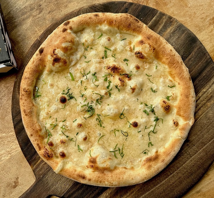 Bianco Base, Baby Spinach, Garlic, Mozzarella, Ricotta, Parmesan, Pine Nuts & Fresh Tomato