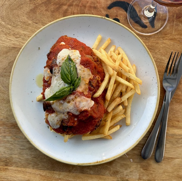 Housemade vegan schnitzel, twice cooked eggplant, vegan mozzarella and Napoletana sauce with fries0